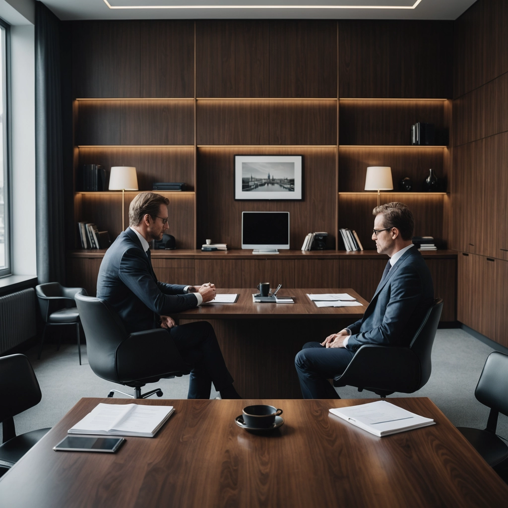 Zwei Business-Experten im Anzug sitzen sich in einem eleganten, holzgetäfelten Büro an einem dunklen Konferenztisch gegenüber. Die konzentrierte Atmosphäre und das diskrete Setting stehen stellvertretend für ein vertrauliches Beratungsgespräch innerhalb einer Whistleblowing Meldestelle.