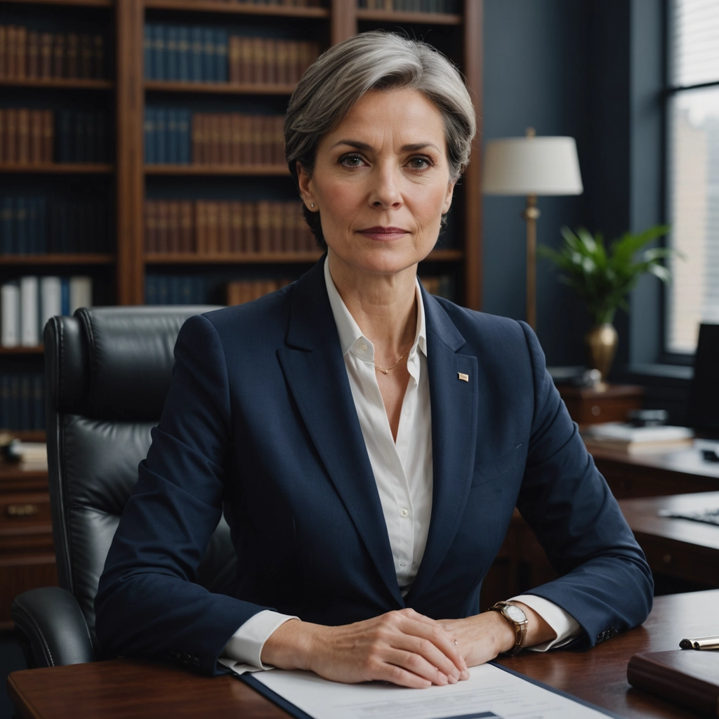 Die Beschreibung der Person und der Umgebung (Bücherregal, Schreibtisch) unterstreicht Kompetenz und Ernsthaftigkeit.
