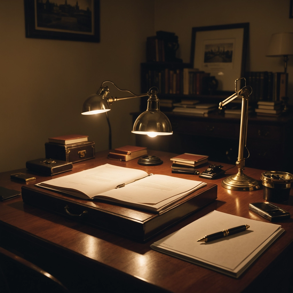 Ein klassischer Holzschreibtisch in warmem Licht, auf dem ein aufgeschlagenes Dossier, ein hochwertiger Schreibstift und Dokumente liegen. Die private Atmosphäre eines Arbeitszimmers steht sinnbildlich für die Vertraulichkeit und gründliche Bearbeitung in einer Whistleblowing Meldestelle.