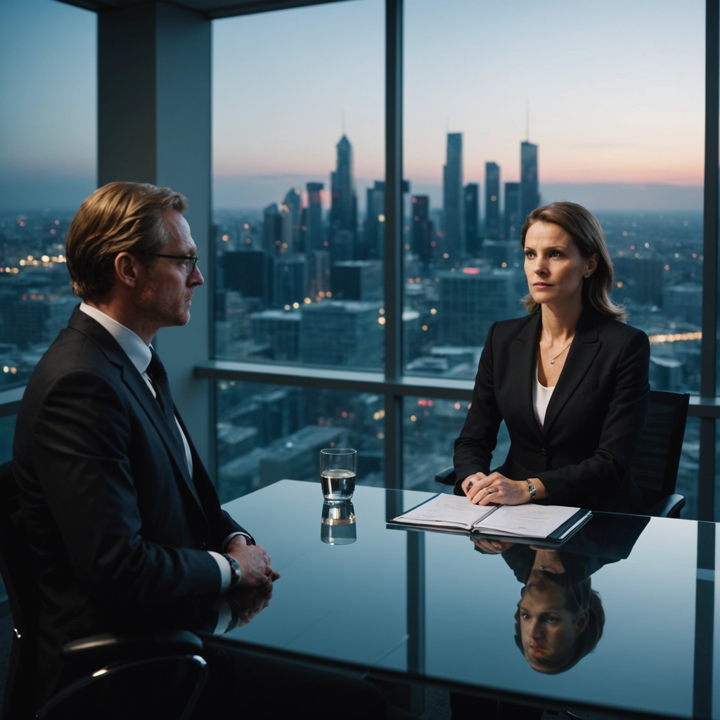 Zwei Business-Profis in formeller Kleidung sitzen sich an einem gläsernen Konferenztisch in einem Hochhaus-Büro gegenüber. Im Hintergrund ist durch die Fensterfront eine urbane Skyline in der Dämmerung zu sehen, was die diskrete und konzentrierte Atmosphäre einer Whistleblowing Meldestelle unterstreicht.