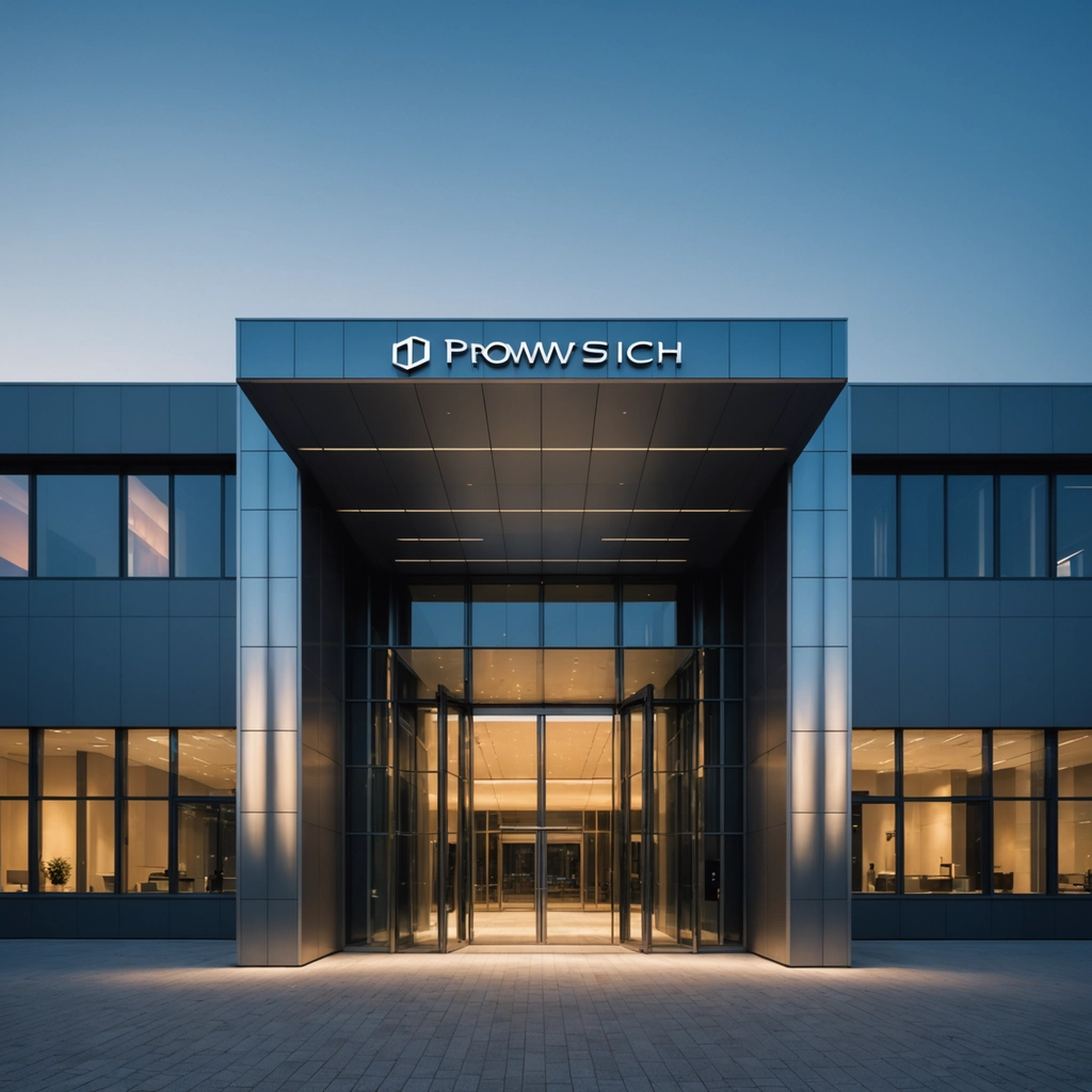 Die beleuchtete Glasfront eines modernen, architektonisch geradlinigen Bürogebäudes in der Abenddämmerung, das als diskreter Standort für eine professionelle Whistleblowing Meldestelle dient.