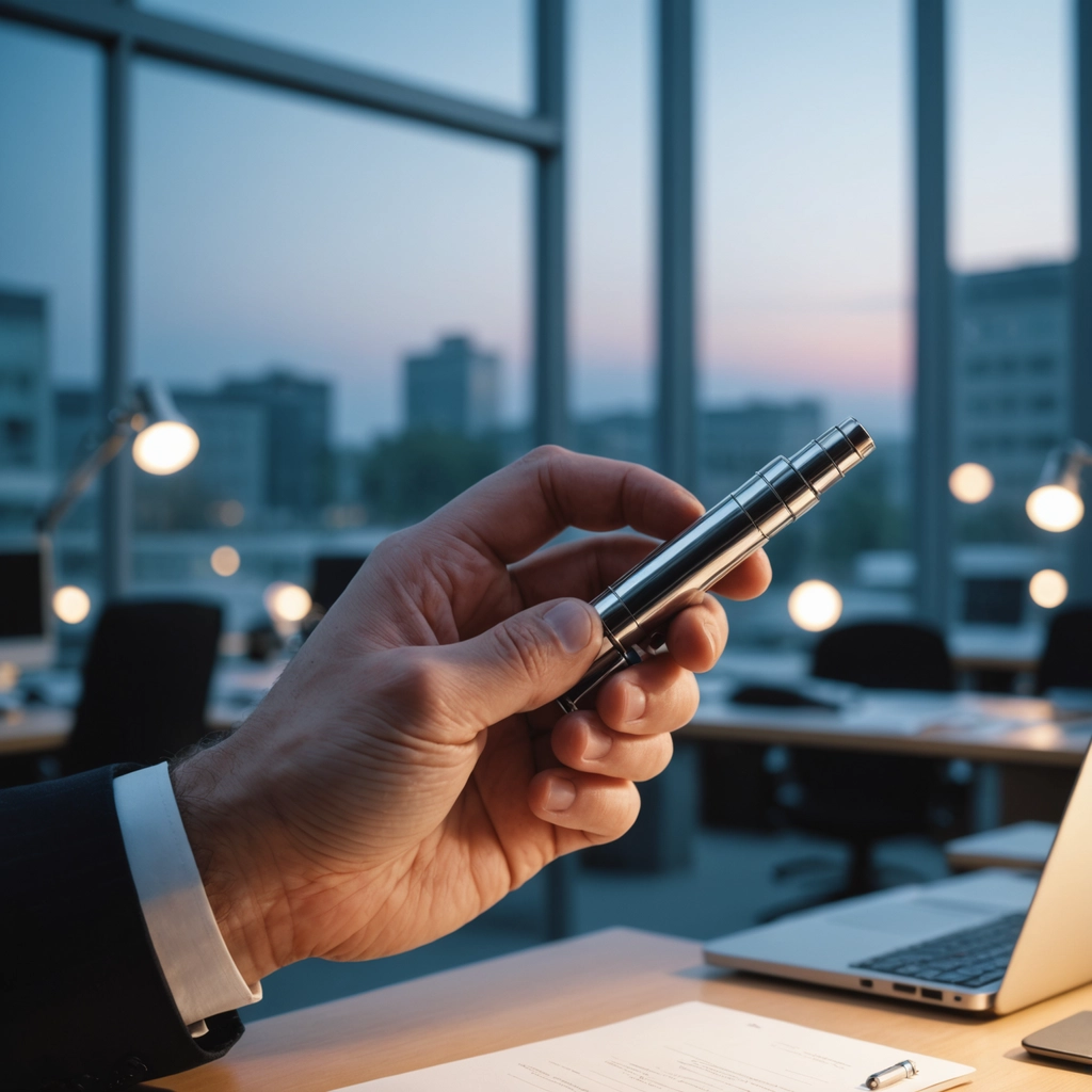 Eine Hand im Business-Anzug hält in einem modernen Büro ein metallisches, stiftähnliches Objekt, das symbolisch für die Sicherheit und Diskretion einer professionellen Whistleblowing-Meldestelle steht.